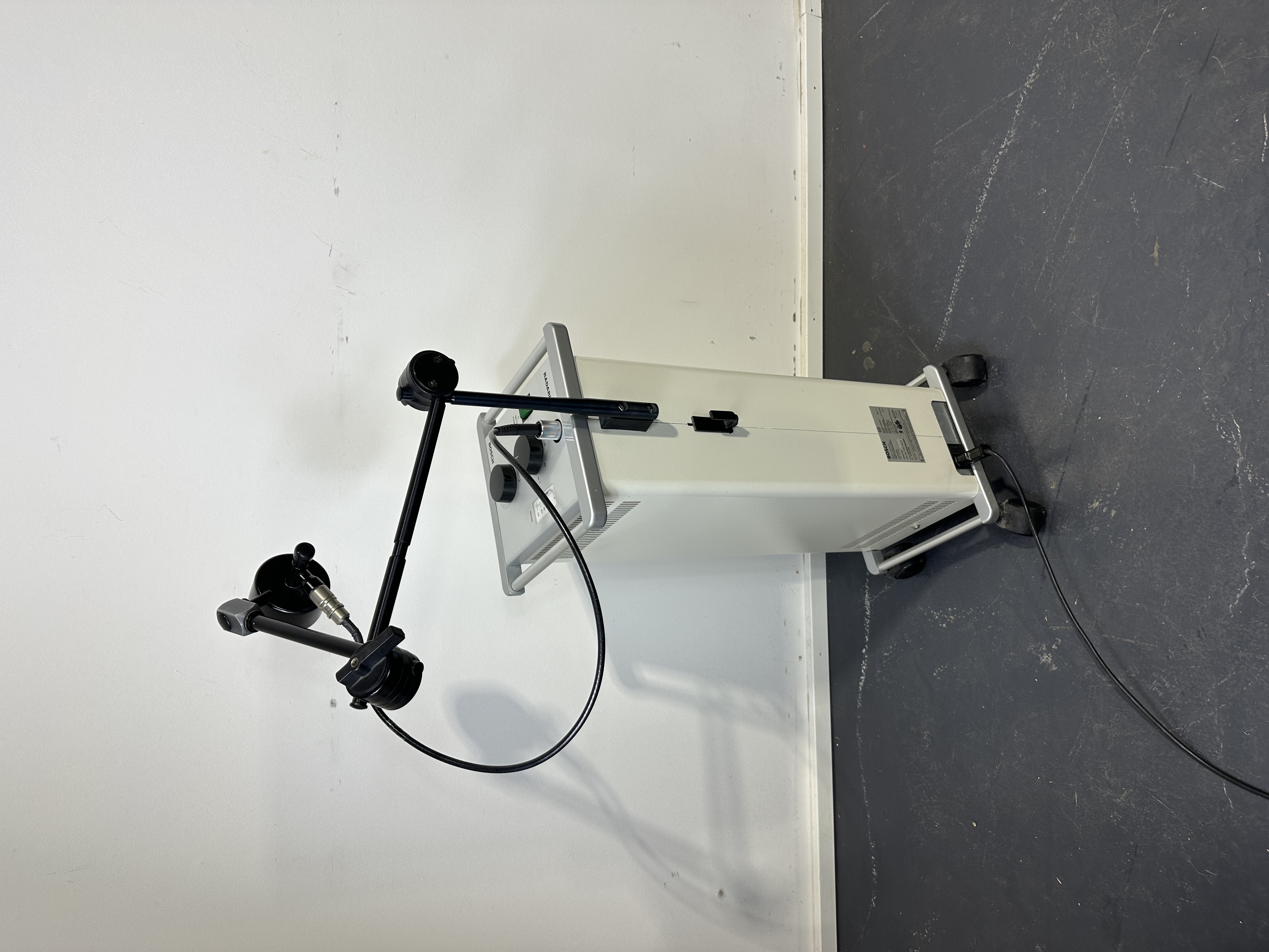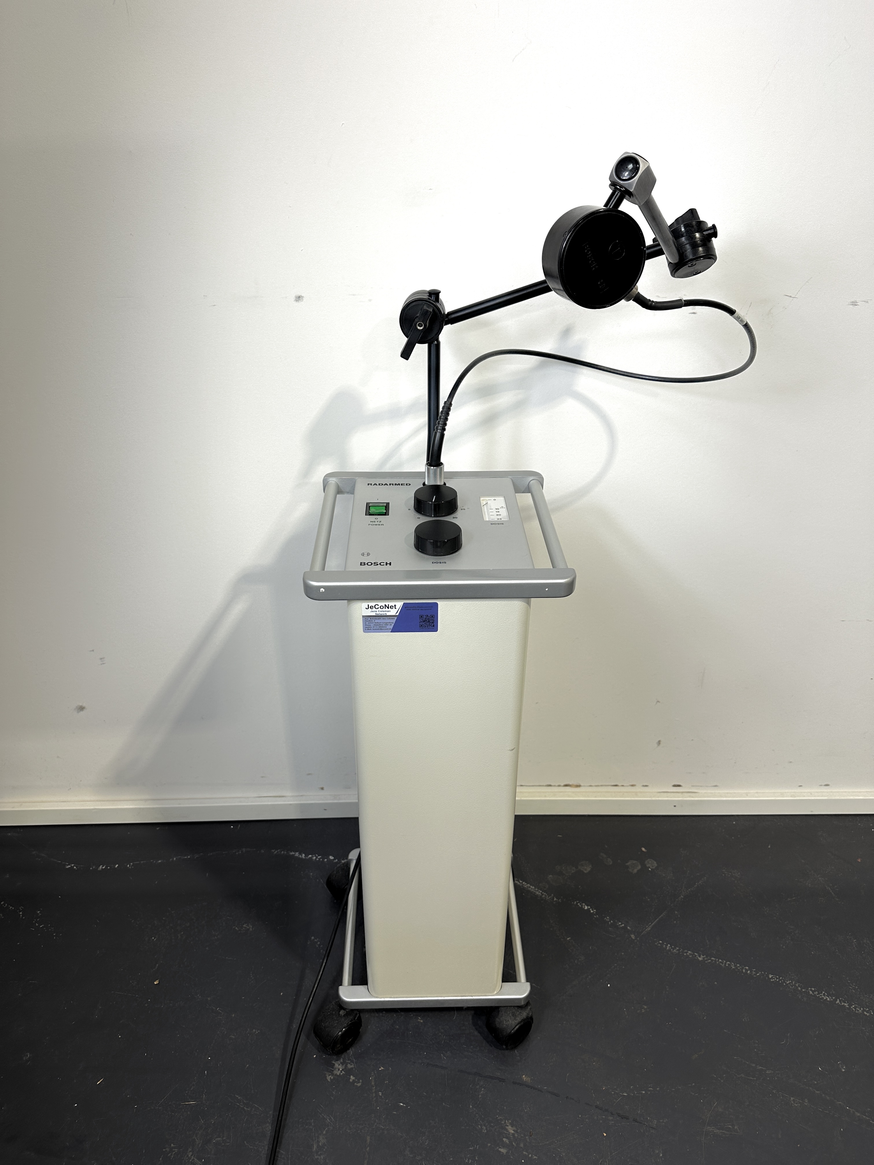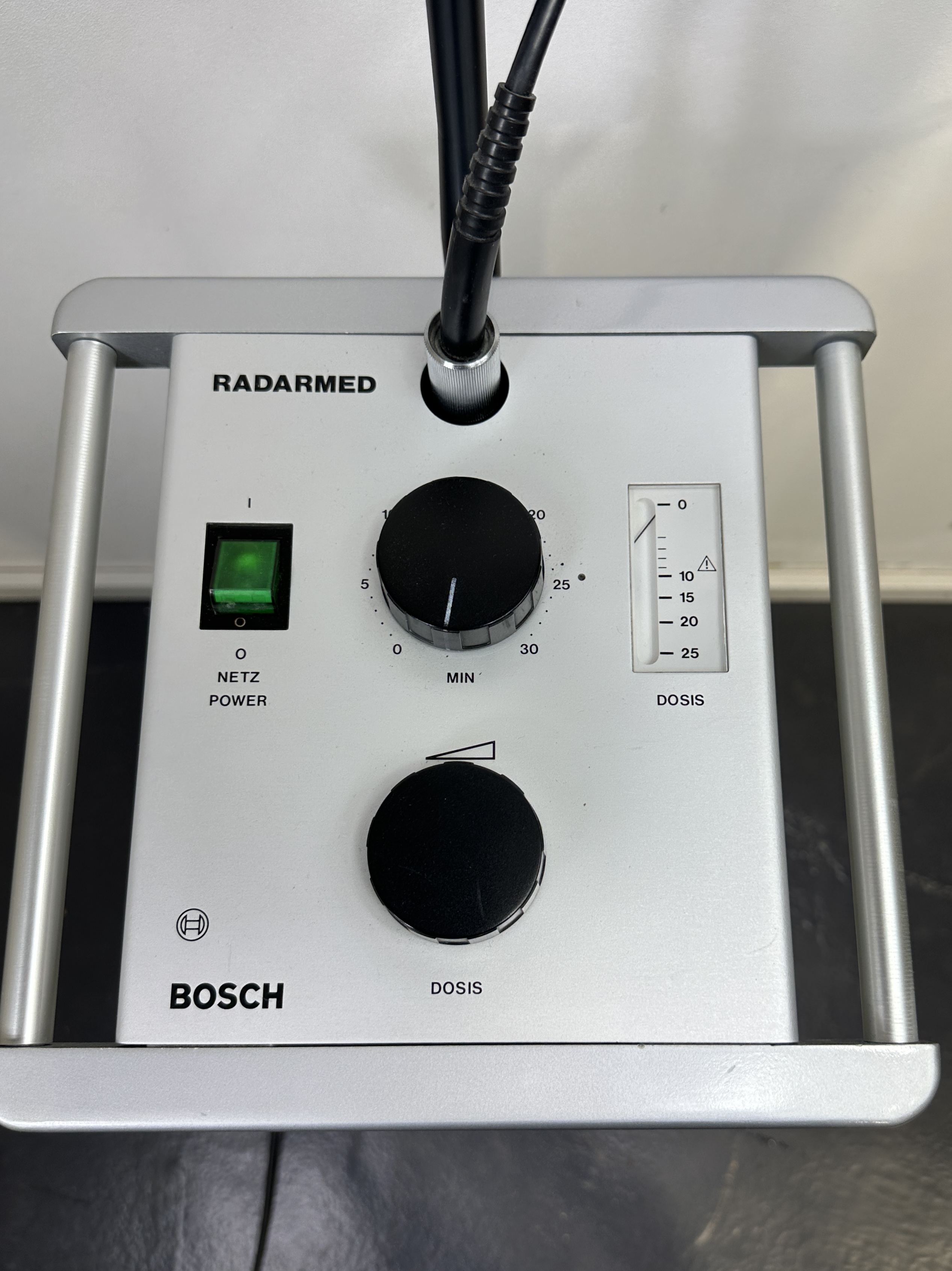 Description: Bosch Radarmed ENT microwave therapy device with timer up to 30min, dose adjustable between 0-25, adjustable holding arm, as shown, good used condition