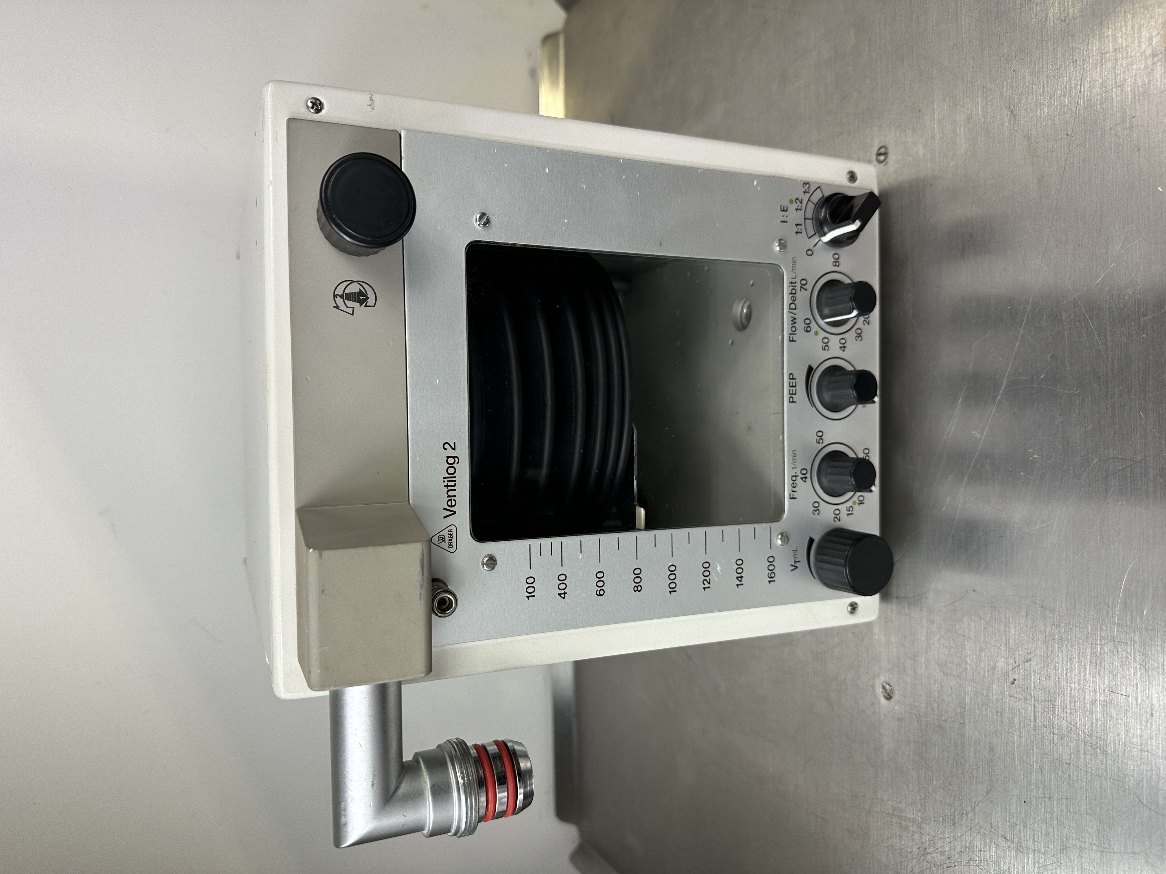 Dräger Ventilog 2 – used, in good condition. The device comes complete with bellows, similar to the illustrations. It is in normal used condition and has been tested for functionality.