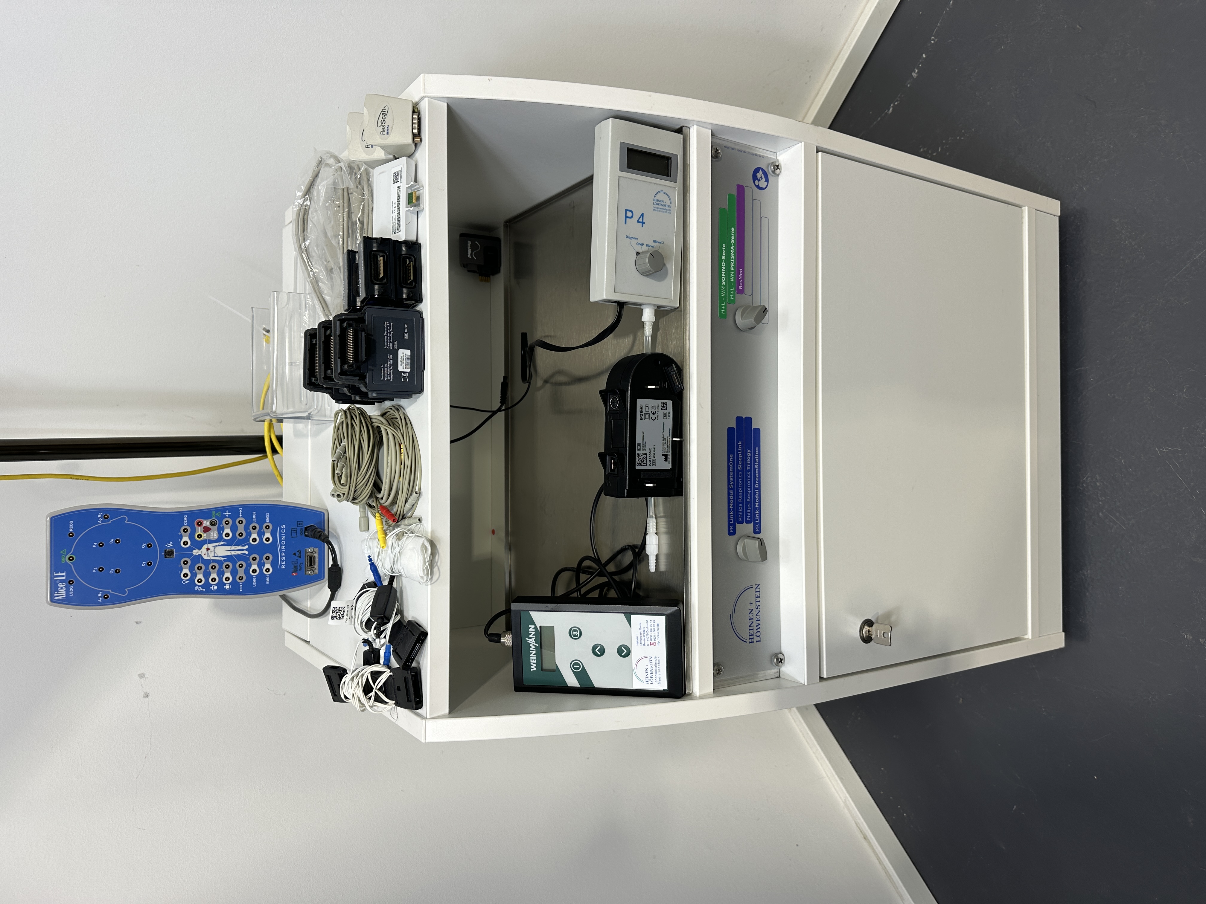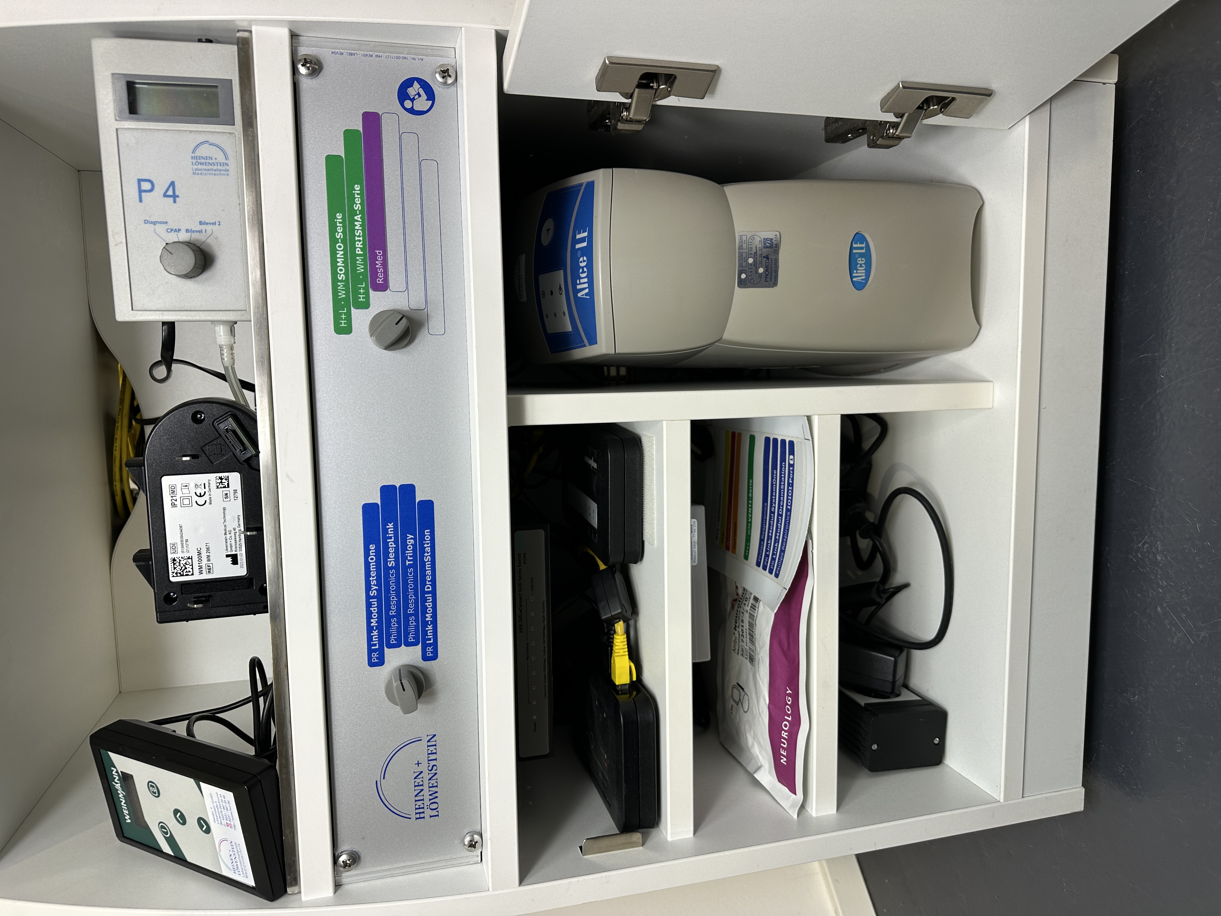 Description: Complete mobile sleep laboratory from Respironics Alice LE, the system consists of a patient room with a mobile cart, equipped with Alice LE Base Station, CPAP P4, Alice LE Headbox, ResMed TX Link, Rotronic Switch, Moxa NPort, HP 1410 8G Switch, Prisma Connect WM 100MC, as well as various cable accessories and cable holders at the bedside. Video and audio surveillance is provided by an Axis camera.