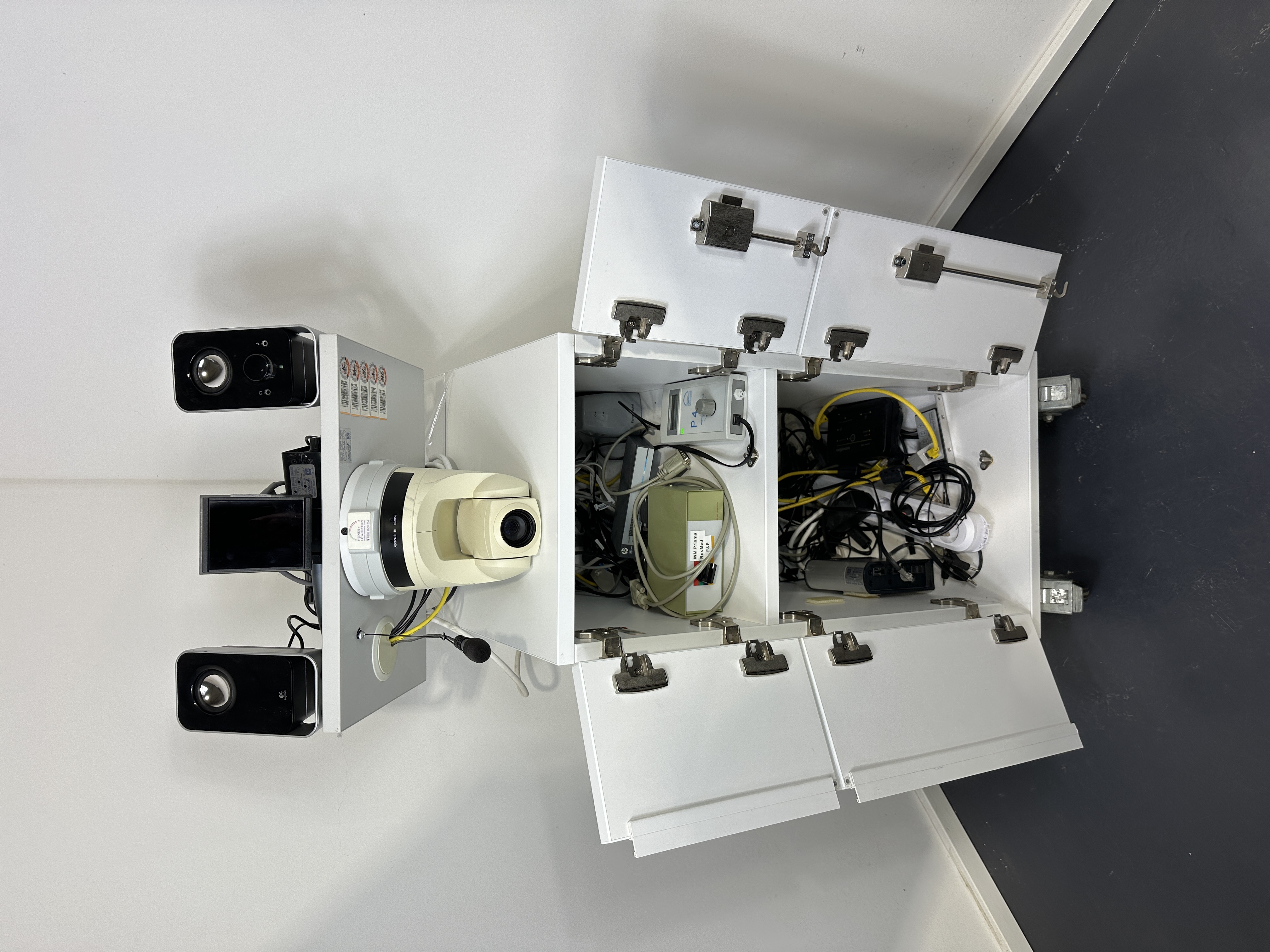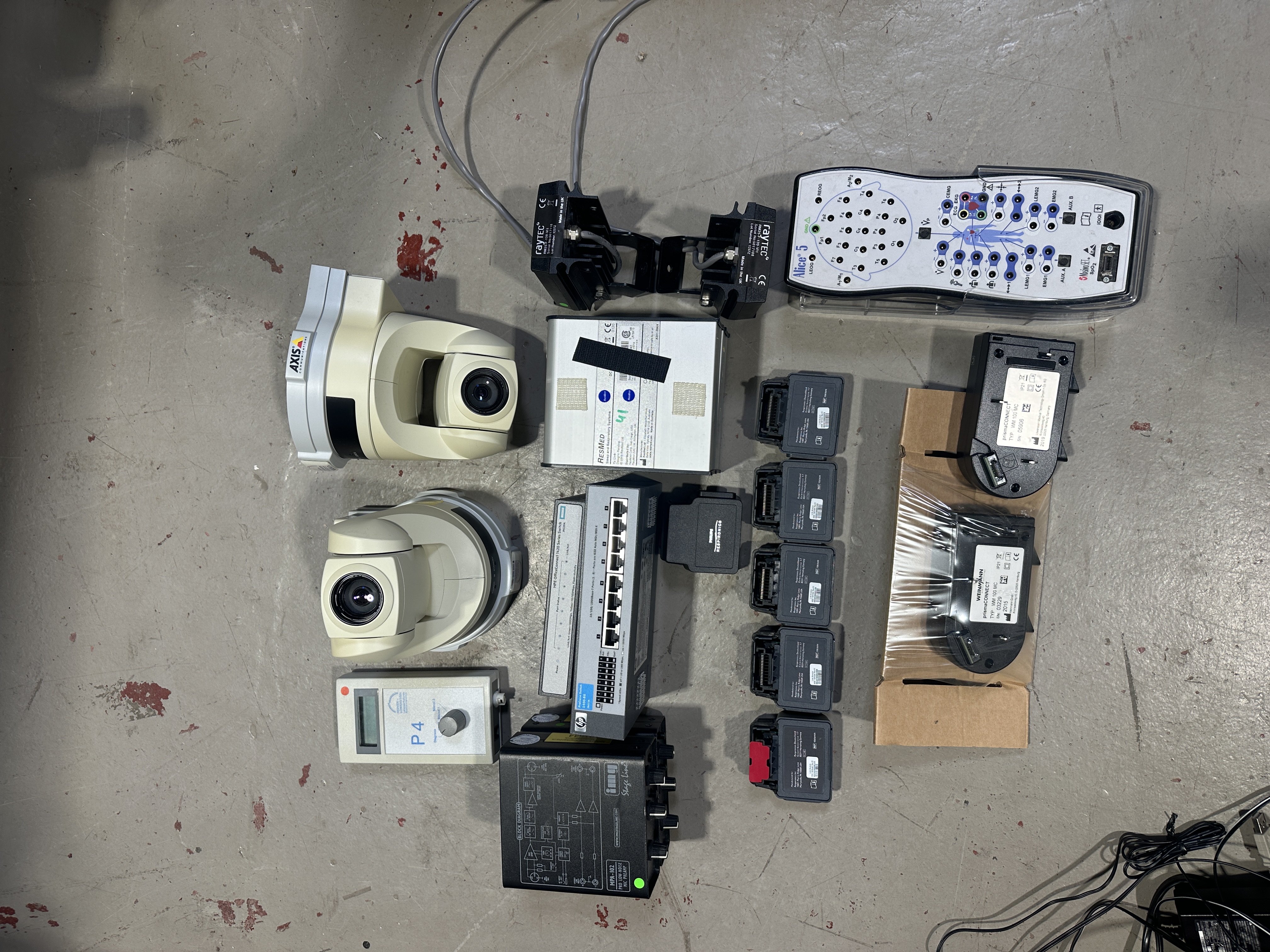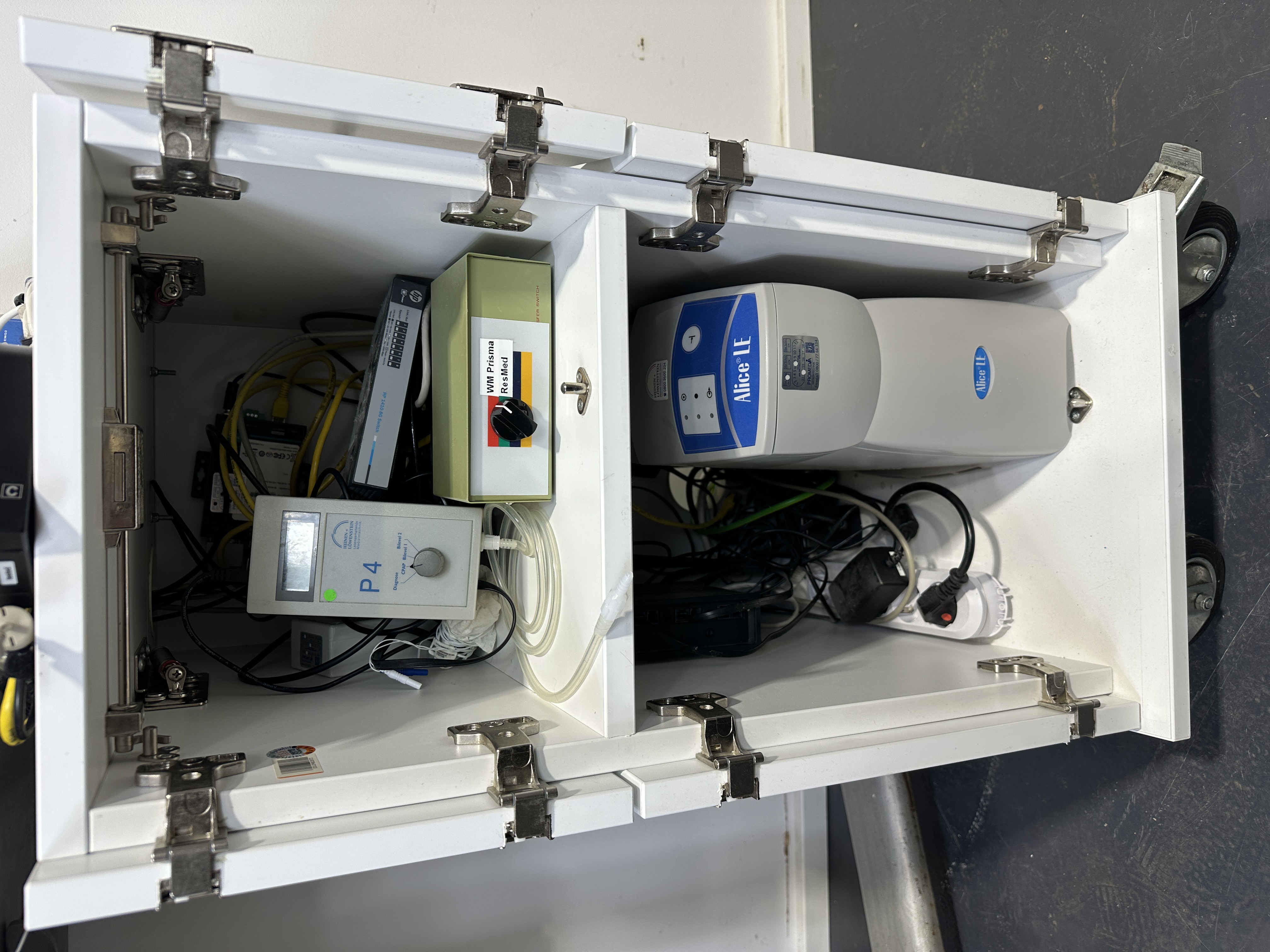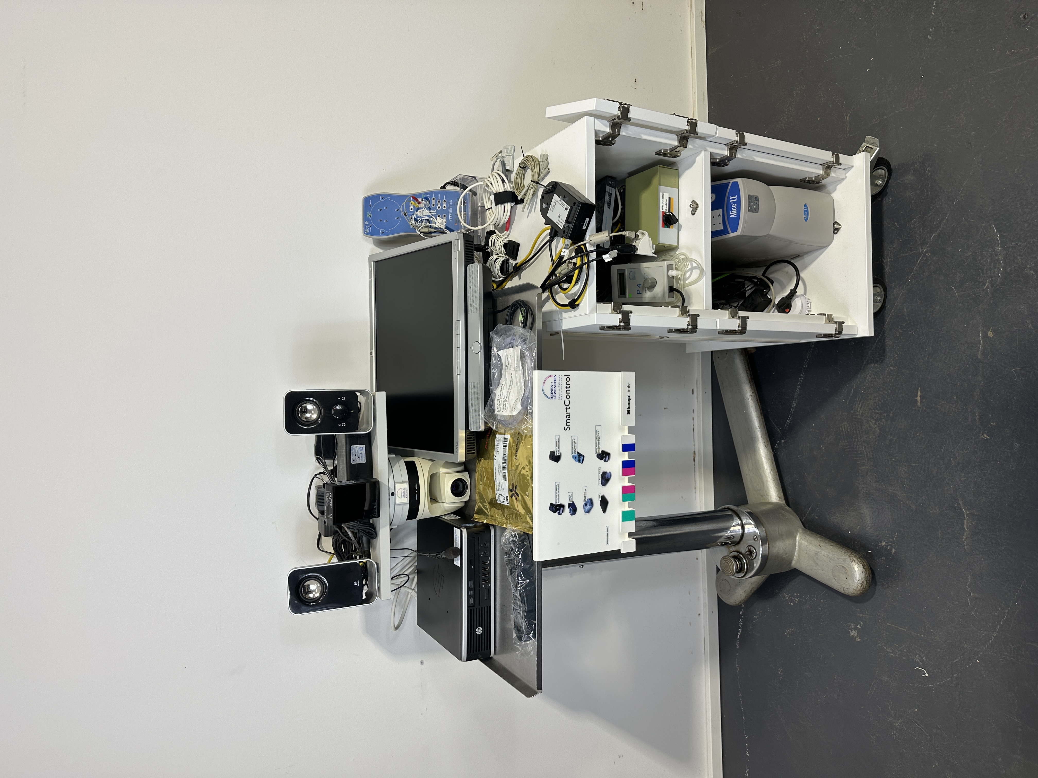Beschreibung: Komplettes Schlaflabor von Respironics Alice LE, fest installiert mit Gegensprechanlage im Überwachungsraum. Das System besteht aus einem Patientenzimmer mit fahrbarem Wagen, ausgestattet mit Alice LE Base Station, CPAP P4, Alice LE Headbox, ResMed TX Link, Rotronic Switch, Moxa NPort, HP 1410 8G Switch, Prisma Connect WM 100MC, sowie diversem Kabelzubehör und Kabelhaltern am Bett. Die Video- und Tonüberwachung erfolgt über eine Axis 214PTZ Kamera, Raytec RM25-F-120-VI1 und Logitech Lautsprecher, wandmontiert im Patientenzimmer. Der Überwachungsraum verfügt über einen Desktop-PC mit Monitor und Verkabelung,so wie Mikrofon. Die Kommunikation zwischen beiden Räumen erfolgt über ein Netzwerk (LAN).